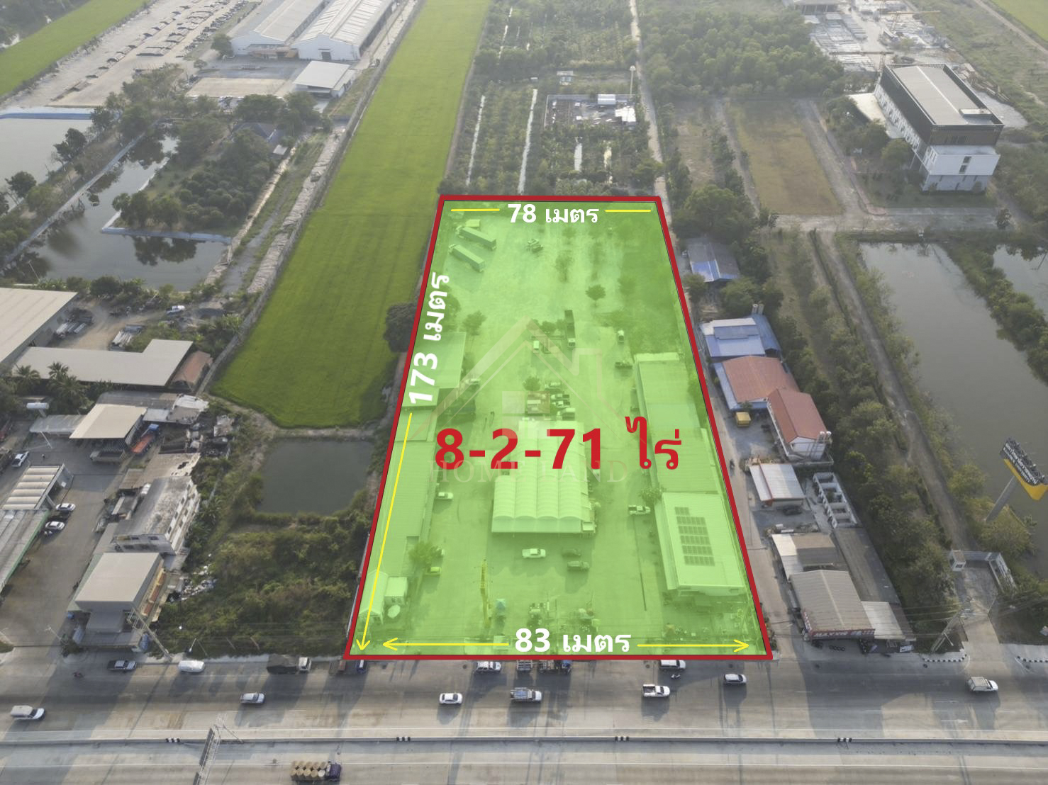 รายละเอียด - เนื้อที่ 8-2-71 ไร่ หรือ 3,471 ตร.ว. - หน้ากว้างโดยประมาณ 83 เมตร ลึกประมาณ 173 เมตร - แปลงสวยสี่เหลี่ยมผืนผ้า